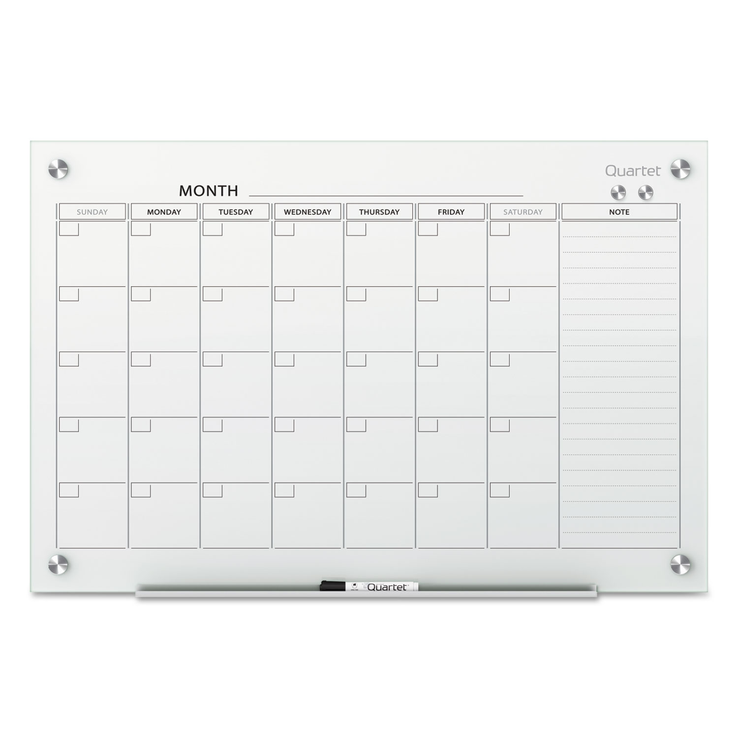Tempered-glass, magnetic dry-erase calendar is highly durable. It provides smooth writing and erases cleanly after every use, without ghosting or staining. The frameless, one-month design is a good fit for any office. Write down appointments or post notes using magnets. Hardware is included for simple and secure wall mounting. Occasional cleaning is recommended for best performance. One marker and magnets included. Board Type: Magnetic Dry Erase Calendar; Board Width: 48"; Board Height: 36"; Surface Material: Glass.