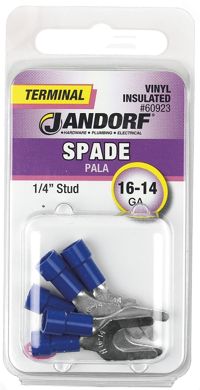 Jandorf Spade Terminal, 600 V, 16 to 14 AWG Wire, Vinyl Insulation, Copper Contact, Tin Contact Coating, 1/4 in Stud, Blue