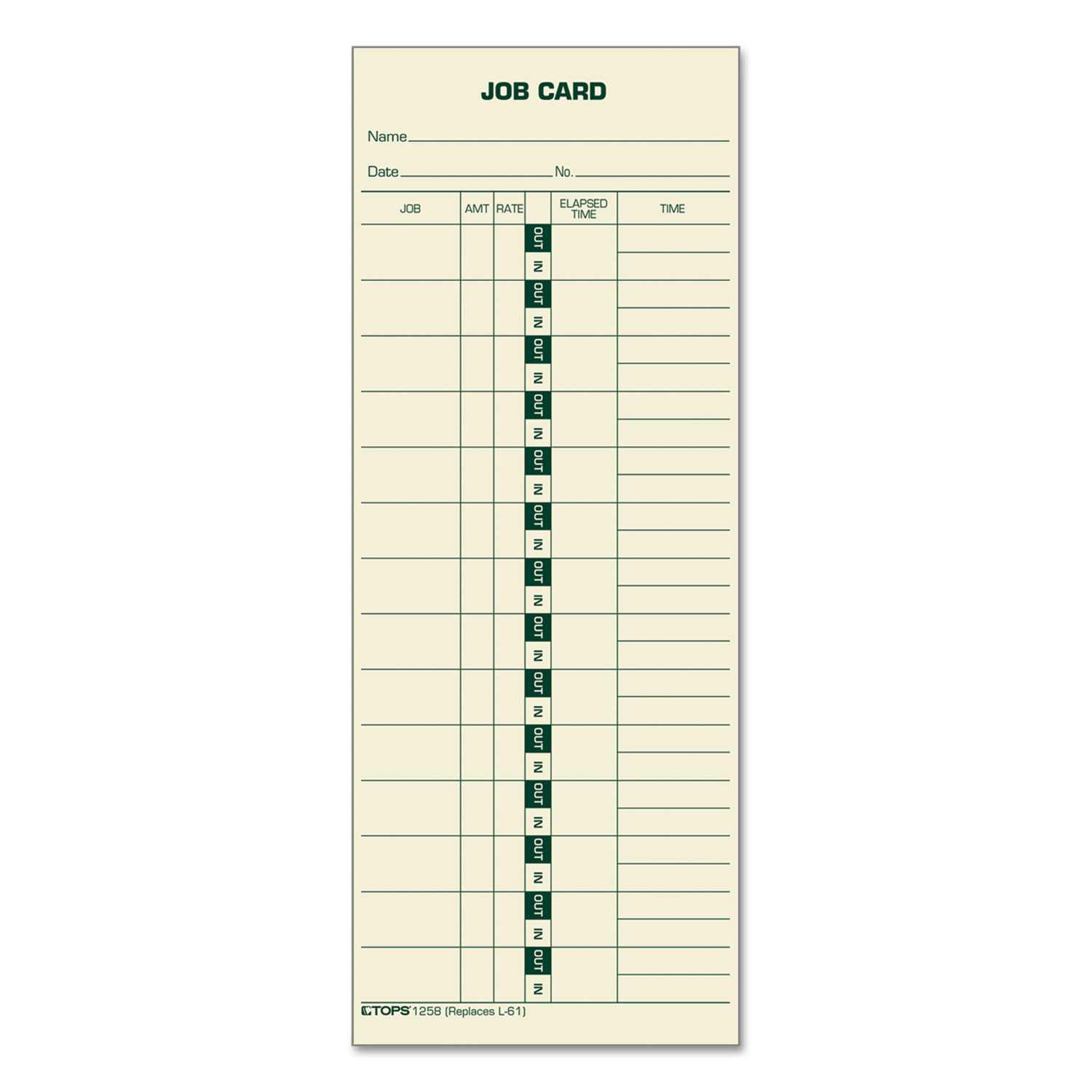 Equivalent to time clock manufacturer's time cards. Boxes to keep track of job, amount, rate, elapsed time and total time worked. 14 lines to track an employee's time worked at different jobs. Manila Stock Printed Green on Front. Size: 3.5 x 9; Time Period: Job Card; Printing Sides: One Side; Card Quantity: 500.