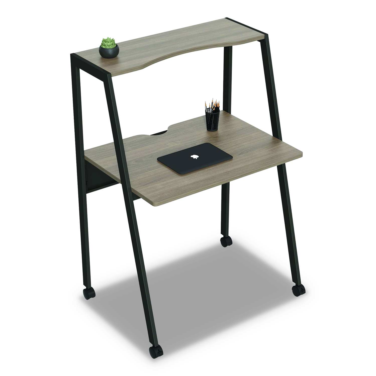 Minimalist two-tier design complements contemporary, modern and traditional decors. Ideal for home offices, dorms, lofts or wherever space is at a premium. Top shelf provides extra storage space. Durable steel frame. Casters for mobility. No tools required for assembly. Series Name: Kompass Series; Worksurface/Base Color: Natural Walnut; Color Family: Walnut; Worksurface Shape: Rectangular.