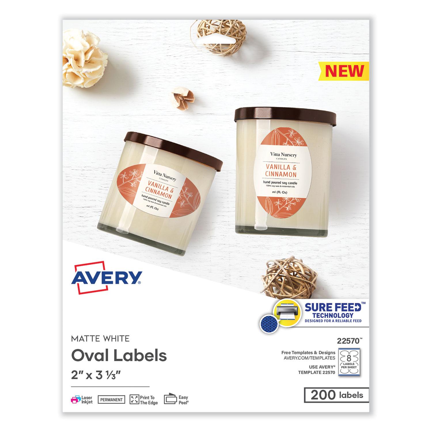 Make sure your handmade gifts and products stand out with Avery labels that offers the professional finishing touch you need. The print-to-the-edge capability allows you to create bright, eye-catching full-bleed labels with sharp text and crisp images printed right to the edge of the stickers with no border or margin. Sure Feed technology helps deliver a more reliable feed through your printer to prevent print misalignments and paper jams. These round printable stickers are quick and easy to apply with the patented Easy Peel label sheets with Pop-up Edge. Simply fold the sheet back to display the label edges for convenient and fast peeling that saves time and avoids label waste. Compatible with both laser and inkjet printers to provide crisp and vivid prints. Avery Design & Print makes it easy to create customized labels from your own home or business. The free browser-based software has everything you need to design gift labels, soap labels, thank you stickers, round stickers for kids, party favor labels, and more. Try it out today. Shape: Oval; Label Size - text: 2 x 3.33; Label Color(s): White; Color Family: White.