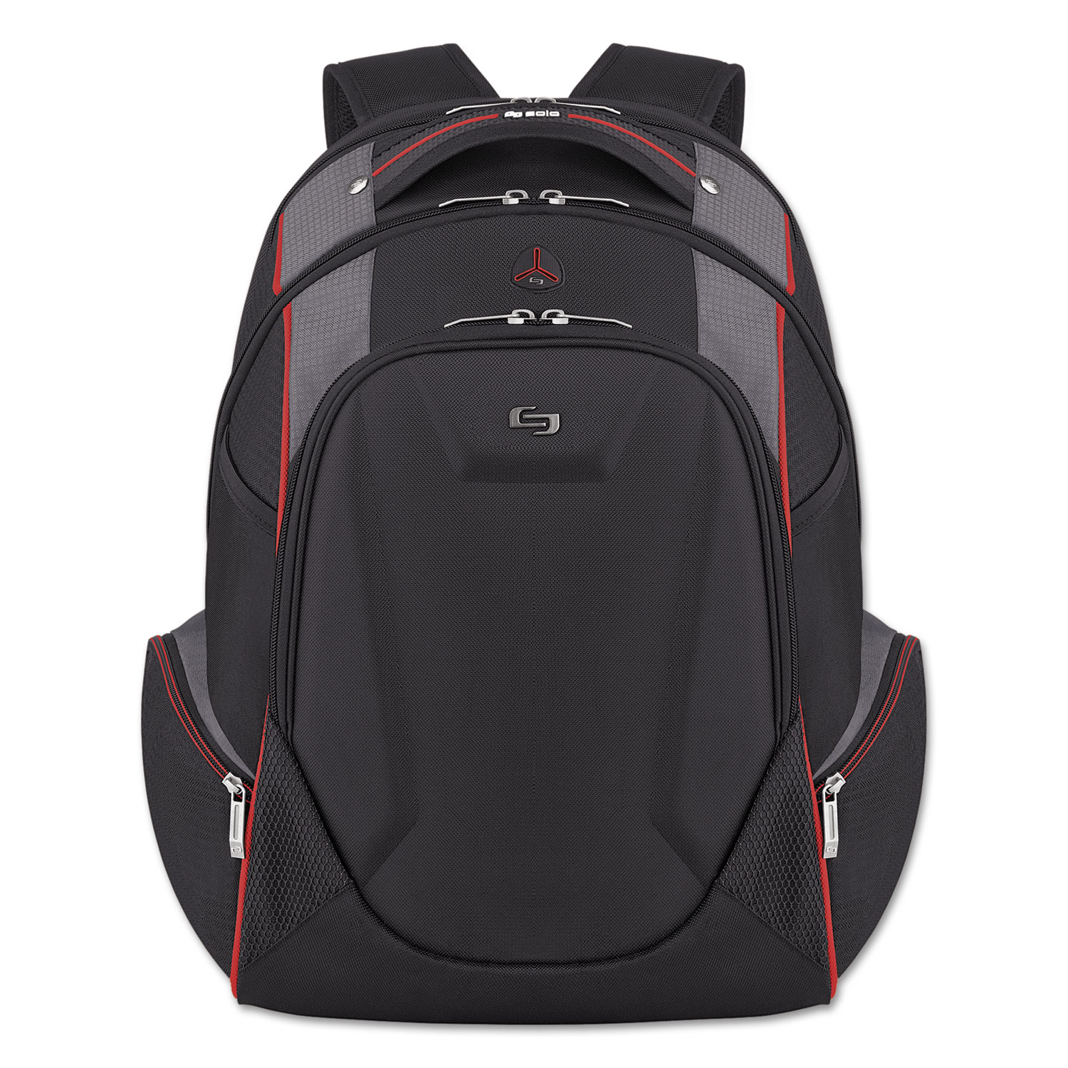 Sporty yet business-savvy, this backpack is designed in an urban-cool color palette. Features fully padded 17.3" laptop compartment and internal iPad/tablet pocket. Hardshell front zip-down organizer section protects gadgets. Side zippered pockets secure accessories and fit most water bottles. Padded back and backpack straps for added comfort. Lightweight. For Use With: Laptops; Color(s): Black/Gray/Red; Color Family: Black; Material(s): Polyester.