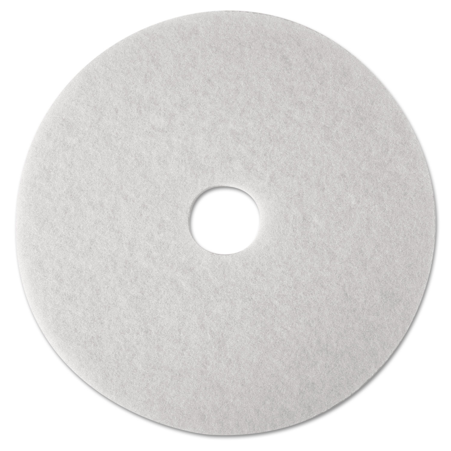 3M White Super Polish Pad 4100 is used for light cleaning under automatic scrubbers and removes soil and scuff marks with minimal dulling of finish. Uniform distribution of fine cleaning particles throughout the pads fibers, not just on the surface, distinguishes it from much of the competition. Durable, conformable polyester fibers provide maximum pad-to-floor contact, and open construction resists loading and clogging. For use with rotary and automatic floor machines running at low speed (175-600 rpm). Use for light daily cleaning, spray buffing, and dry buffing soft finishes. This polishing pad is also used on wood floors. The pad is reversible. Application: Buffing; Diameter: 16"; Height: 1"; Color(s): White.
