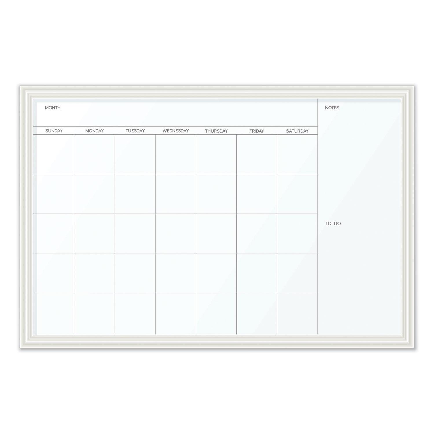 White wood finish, modern decor dry erase calendar board is a perfect and functional solution for the frequent usage areas of your office, school classroom, home or any commercial space. Clean, contemporary and simple product design lines will add a touch of subtle style to your wall. Although all dry erase markers work well with this board, the U Brands dry erase markers provide the ultimate writing and eras-ability experience. The board's magnetic painted steel writing surface will require minimal ongoing cleaning care to ensure the best performance and resist ink staining and ghosting. Monthly view enables you to keep track of your hectic schedule. Simply use any dry erase board spray or wet dry erase board wipes after continuous use to clean the writing surface. You may also attach all U Brands magnetic board markers and accessories (sold separately) directly onto the board surface. Universal mounting system, as it can be hung horizontally to fit your allocated space. Board Type: Magnetic Dry-Erase Calendar Board; Board Width: 30"; Board Height: 20"; Board Depth: 1".