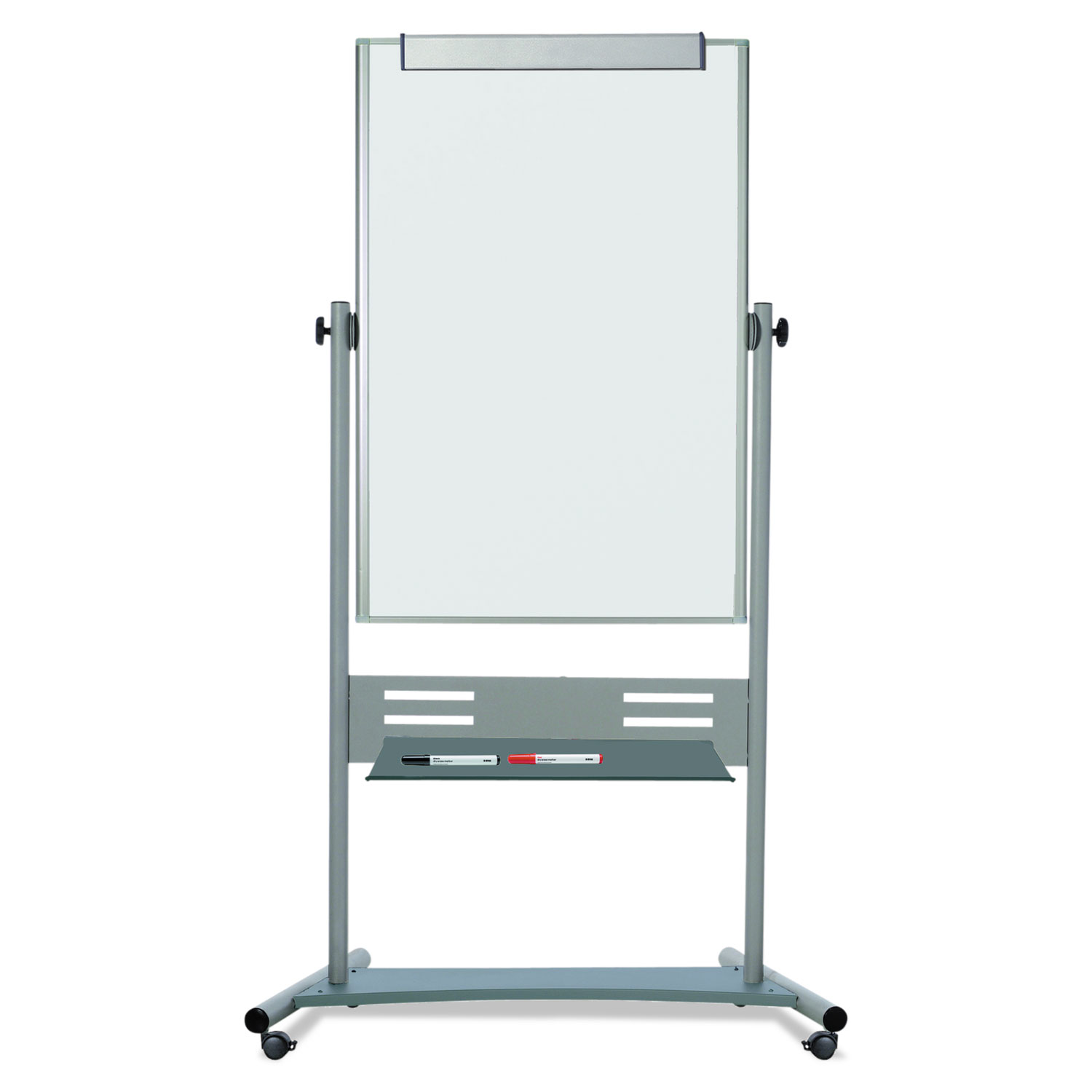 Revolving double-sided dry erase mobile presentation easel is heavy-duty and reversible. It features a Magnetic Gold Ultra lacquered steel surface on both sides. Extra-large repositionable steel pen tray can be positioned in several places. Tubular steel frame, support bars and easy glide locking castors make this one of the most stable large mobile easels in the marketplace. Durable and versatile, this easel is perfect for classrooms and all training environments. Mobile and practical to use, it helps ensure that you can adapt to any room and keep your audiences attention. Maximum Easel Height 80"No-pinch pad retainer holds easels of any size. Board Type: Magnetic Dry Erase Easel; Board Width: 35.4"; Board Height: 47.2"; Surface Material: Gold Ultra Enameled Steel.