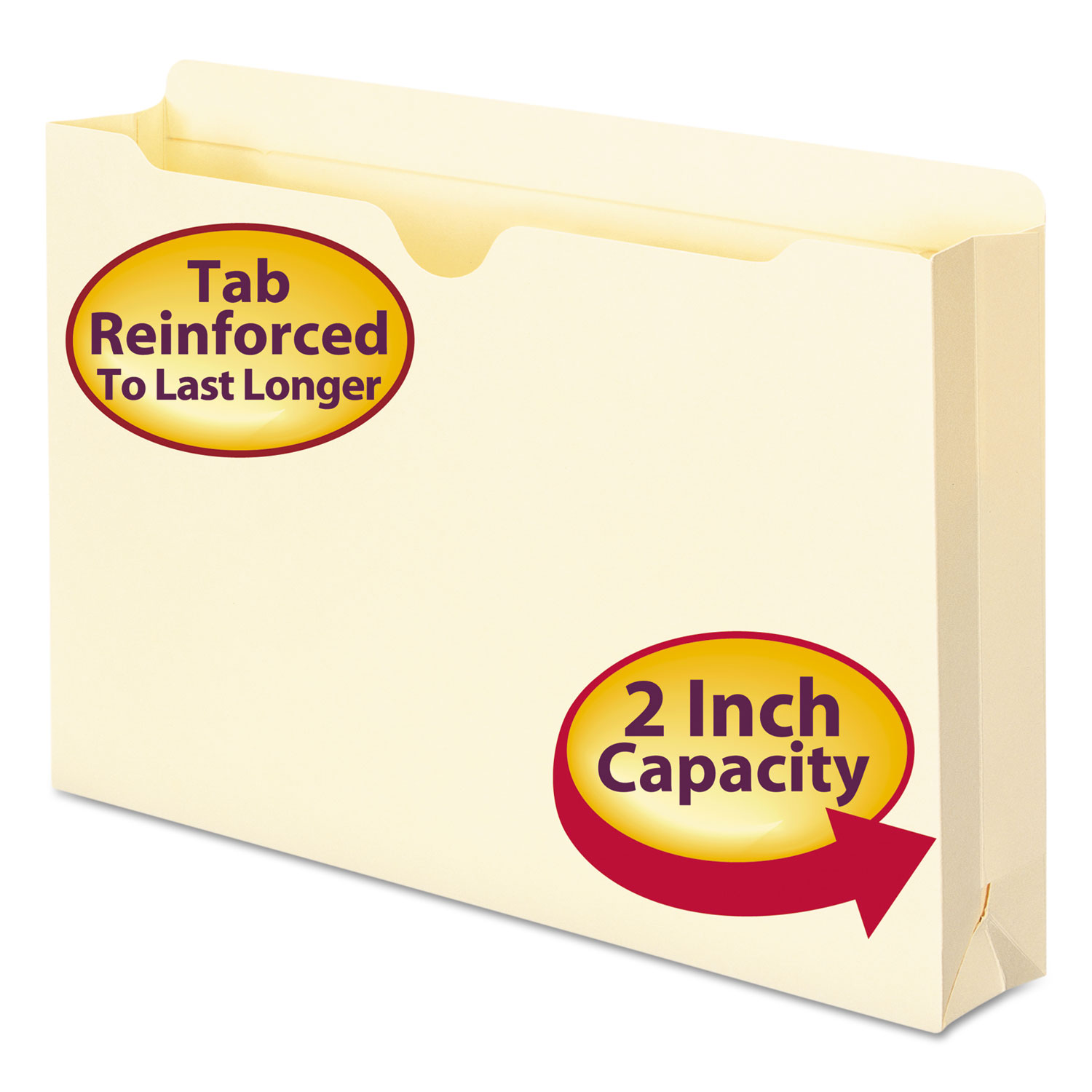 Great way to transport files out of the office. Closed sides keep papers secure. Straight cut tab. Thumb cut for easy access to documents. Back tab is 1/2" higher than front for indexing. Reinforced Double-Ply Tab. Number of Sections: 1; Tab Cut: Straight; Size: Legal; Punched/Unpunched: Unpunched.