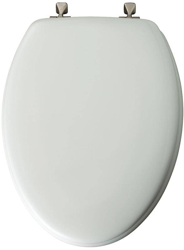 This molded wood seat provides durability and stability. The brushed-nickel metal hinges are stylish and long-lasting. With the STA-TITE seat fastening system, the seat does not shift around and stays firmly attached to the toilet. For residential use only. Made in USA.