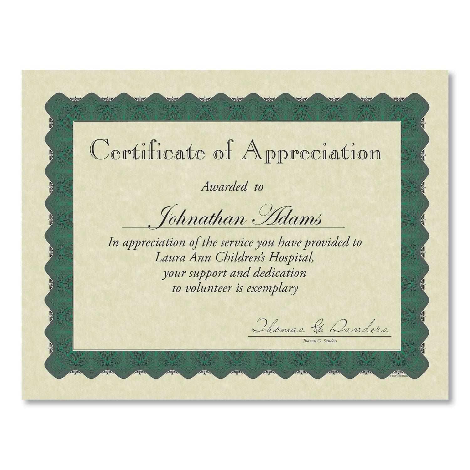 Create professional documents for graduation ceremonies, awards, and contest winners by printing custom designs on these parchment-patterned certificates. Delicate metallic border calls attention to recognized achievements. Lignin- and acid-free sheets are compatible with both inkjet and laser printers. Shape: Rectangle; Width: 11"; Height: 8.5"; Color(s): Ivory/Green.