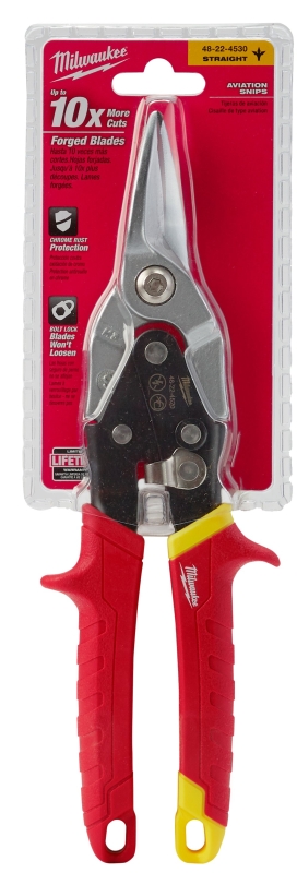 Milwaukee aviation snips are built for long life and durability. Forged blades deliver up to 10X more cuts than cast blades. Bolt lock ensures the blades won't loosen and chrome plating provides rust protection. The flush pivot bolt won't hang-up on material for easy use. The metal lock secures the tool for storage and is easily operated with one hand. Ideal for straight cuts.