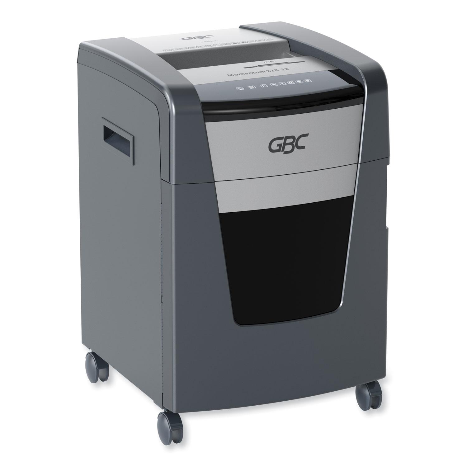 Keep sensitive and confidential information safe and secure with the GBC Momentum Paper Shredder. This shredder uses a micro-cut style shred, which provides P-4 Level Security. It's a great choice for shredding in the modern office. Active Sensing Anti-Jam Technology helps prevent and fix jams, which keeps your machine running smoothly. The high-performing motor has an impressive continuous run time so you can get more done without stopping. Special features include a bin full indicator, auto shut-off and eco mode. This machine easily shreds CDs, credit cards, paper clips, staples and junk mail. Recommended Shredder Users: 1 to 5; Run Time: Continuous; Motor HP: 0.2 hp; Daily Usage Level: Medium.