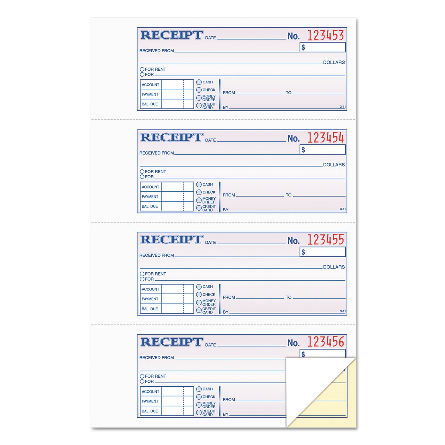 Use to record monies received. Consecutively numbered in red. Black-print copies. Wrap-around stop card prevents "write through." Carbonless DuplicateAccount and Payment Type section. Form Size: 7.13 x 2.75; Forms Per Page: 4; Form Quantity: 200; Principal Heading(s): Receipt.