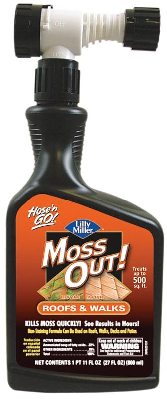 Kills moss and algae quickly. See results in hours. Non-staining formula can be used on roofs, walks, decks, patios, bricks, concrete or asphalt. Sprays up to 25 ft. Hose end bottle with jet sprayer. Treats up to 500 sq-ft.