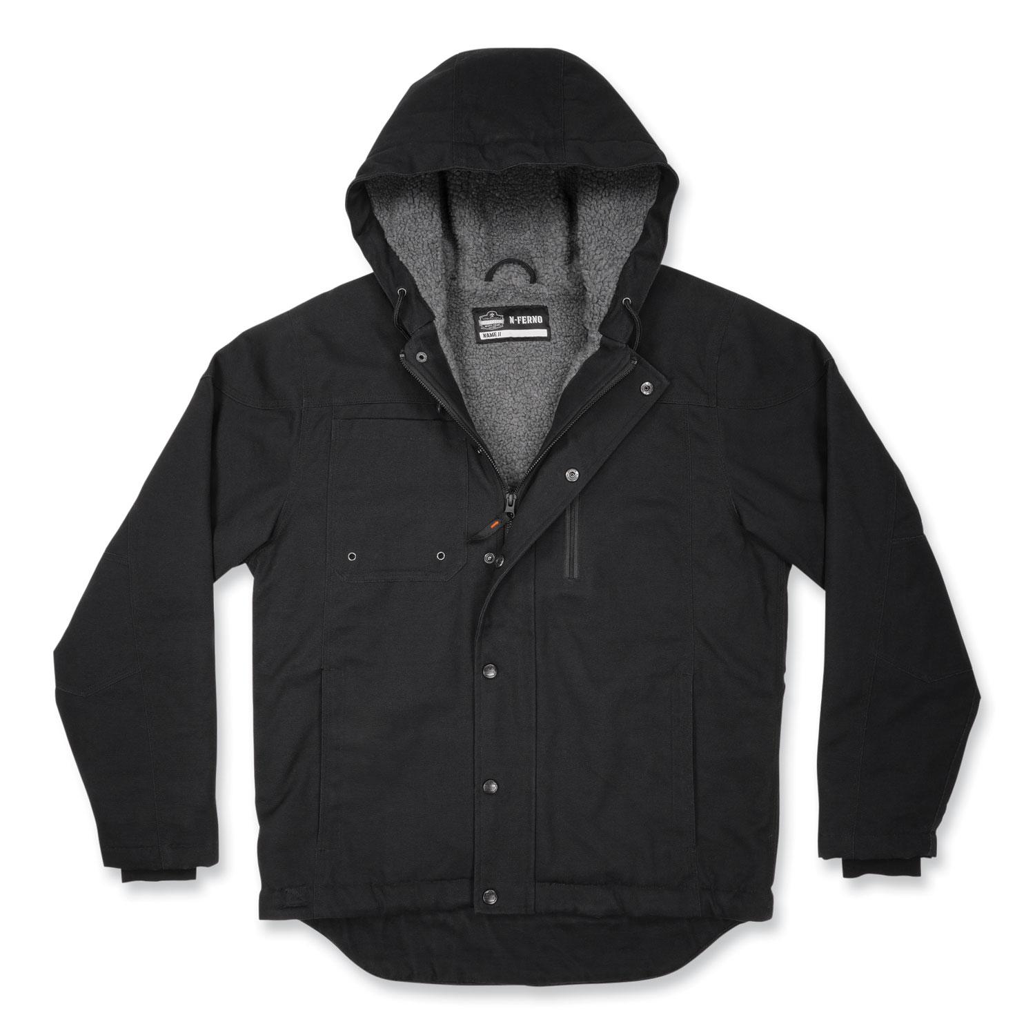 The N-Ferno 6468 Heavy-Duck Canvas Work Jacket is a rugged midweight jacket for warmth in cool conditions. The cotton duck canvas features a wind- and water-resistant DWR finish for long-lasting durability and dry all-day wear. The body and hood are lined with warm and comfortable sherpa, while the flexible gusseted sleeves feature 40 gm quilted insulation for warmth without compromised mobility. For a snug and custom fit that keeps cold air out, this canvas work jacket features rib knit cuffs, an elastic bungee waist, drawstring hood and a long tail that won't ride up. Built for the job, the hood is large enough to be pulled up over hard hats. A zippered closure with snap buttons makes for easy on and off. This sherpa-lined canvas jacket features six pockets for convenient storage. Apparel Type: Thermal Jacket; Material(s): Canvas; Color(s): Black; Color Family: Black.