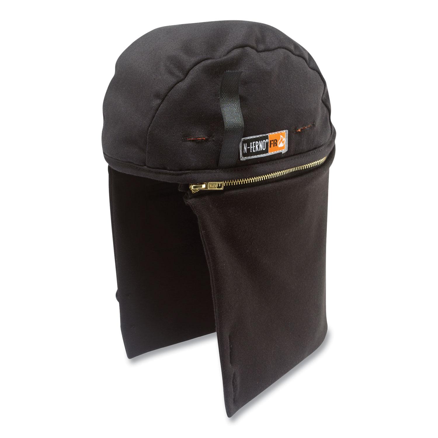 The N-Ferno 6885 FR Winter Hard Hat Liner provides warm fire-resistant (FR) protection for those working in cold environments where arc flash is a risk. Made with two layers of FR modacrylic-cotton twill blend for enhanced warmth and comfort. This lightweight shoulder-length thermal liner is extra-long to keep head, ears and neck covered while fitting comfortably under helmets or hard hats without bulk. The unique zip-off cap design allows workers to remove the bottom part of the liner for wear alone as a thermal FR skull cap. It can also be buttoned atop hard hats to keep the bottom up and out of the way. To attach to a hard hat, remove the suspension and thread the system through the four slots in the liner. Then, secure the four hook and loop points to the suspension before inserting back into the hard hat. You can also unzip the lower neck cover for wear as a standalone FR cap. Apparel Type: Winter Liner; Material(s): Modacrylic Cotton; Color(s): Black; Color Family: Black.
