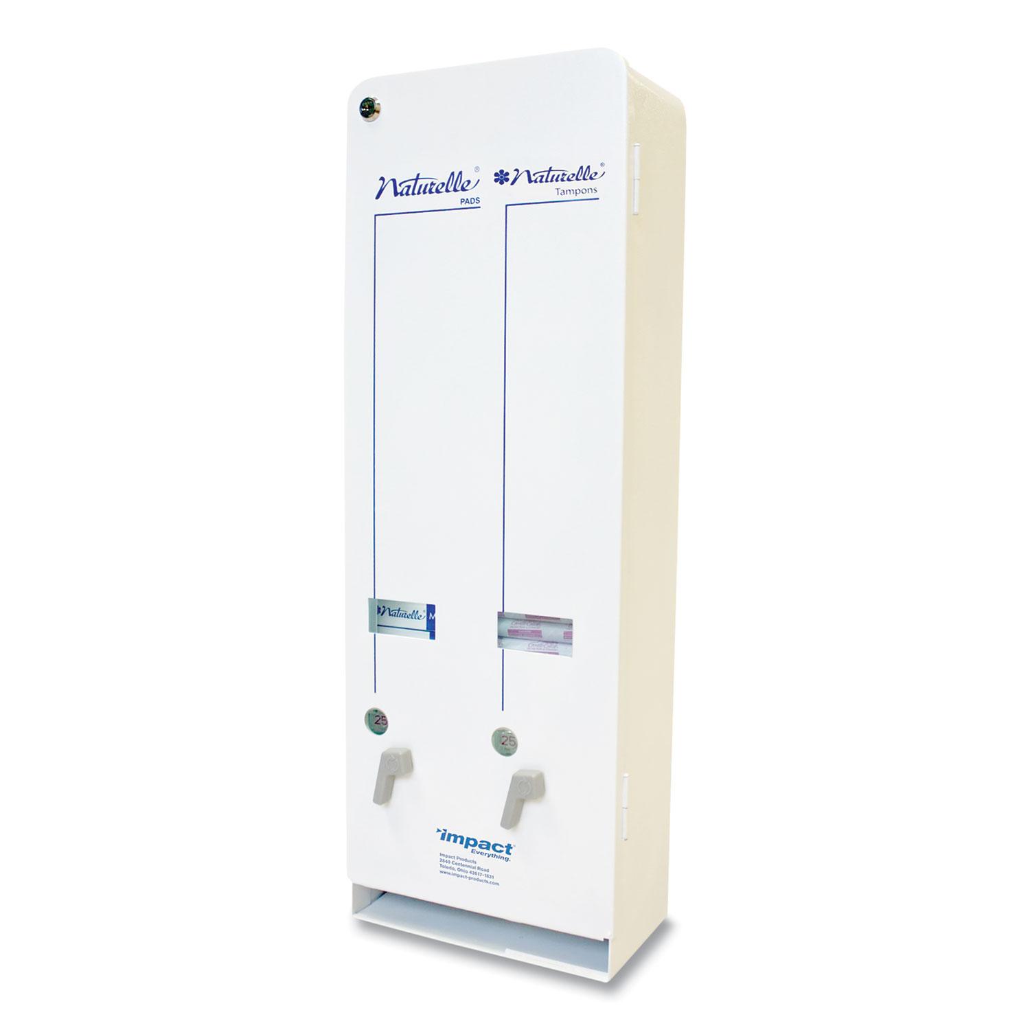 Ensure guest convenience when you install this Impact feminine product dual-dispenser machine in your building's restrooms. Separate dispensers for #4 napkins and tampons offer users two choices to meet their personal needs. All-metal construction delivers enduring quality. Features coin payment mechanisms for easy vending. Holds: #4 Napkins; Tampons; Material(s): Metal; Color(s): White; Color Family: White.