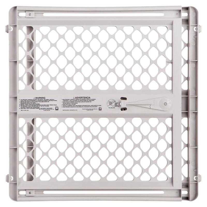 Comes as a pressure gate for immediate mounting to doorways. Specially designed rail sockets included to allow gate to be used between wrought iron railings. Hardware included for hinge mounting to make a swing gate. Can be used between wall and wrought iron railings. Rounded edges will not pinch. Ideal for pets too. Width expands 26 to 42 in.