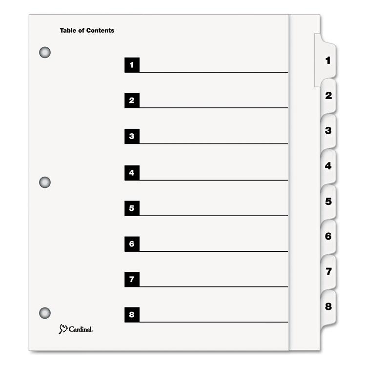 Create as many custom indexes as you need in just minutes, using your office copier or computer printer. Dividers are extra wide to use with sheet protectors and collector pages. Tabs and ring edges are reinforced to withstand heavy use. Easy to use, no-cost templates in your favorite software are available online; details on packaging. Index Divider Style: Arabic Numeric; Index Divider Size: 11.25 x 9.75; Punched/Unpunched: 3-Hole Punched; For Use With: Ring Binders.