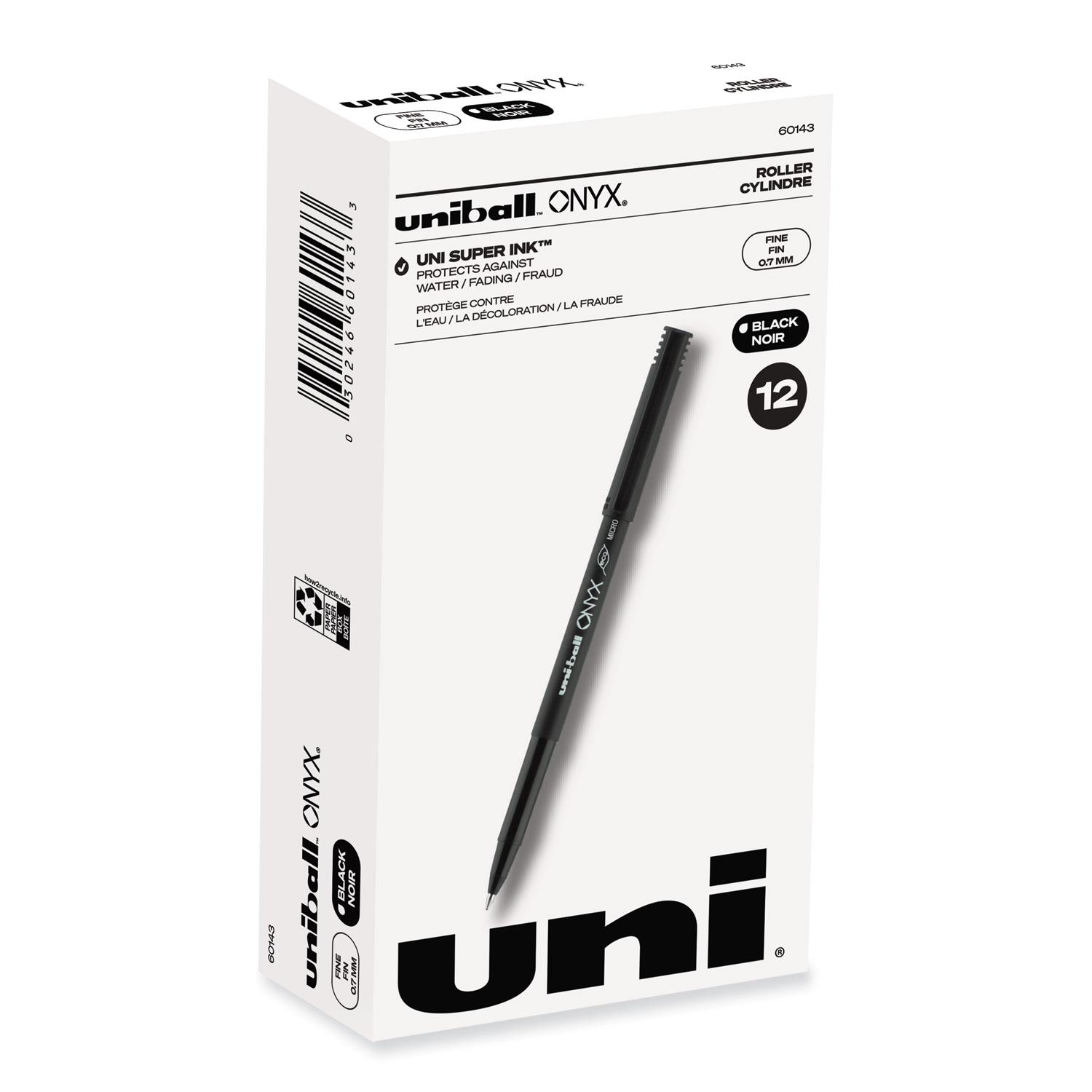 Stock your office, home or classroom with Onyx Rollerball Stick Pens from uni-ball featuring strong, long lasting tip sizes. This rollerball pen delivers the silky-smooth glide of a fountain pen without smudging for effortless writing. ONYX pens produce crisp and precise lines for intricate writing, making it easy to create super fine details in your drawings and diagrams. Capped roller pens are useful for a variety of tasks from note taking to signing checks and legal documents to uniquely embellishing fun and creative writing projects. Innovative uni Super Ink technology forms a strong bond with the paper, protecting from water, fading and fraud. A great economic and environmentally-conscious choice as this super sleek micro point roller pen is made from post-consumer recycled material. Pen Sub-Brand & SKU Line: ONYX; Pen Style: Stick; Pen Type: Roller Ball Pen; Refillable (Yes/No): No.