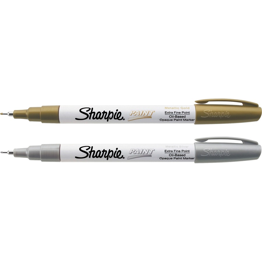 Oil-based opaque paint markers for marking on light or dark surfaces. For metal, pottery, wood, rubber, glass, plastic, stone and more. Quick drying, water-, fade- and abrasion-resistant ink. Xylene-free. Marker Ink Type: Permanent; Marker Tip Type: Bullet; Marker Tip Size (text): Fine; Marker Color(s): Assorted Metallic.