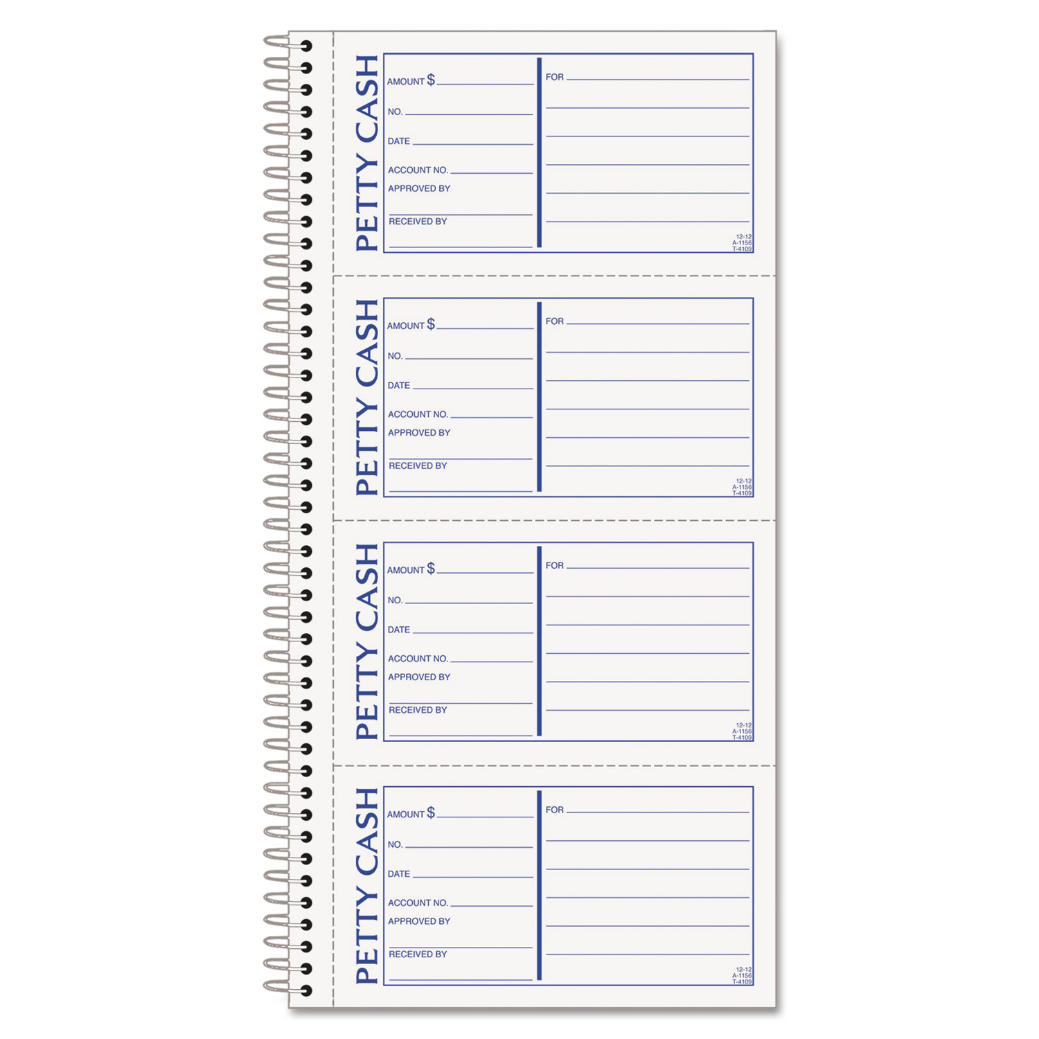 Spiralbound book keeps permanent record of cash disbursements. Space for date, amount, approval, account and number. Six writing lines to state purpose of petty cash. White with canary duplicate. Form Size: 5 x 2.75; Forms Per Page: 4; Form Quantity: 200; Sheet Size: 11 x 5.5.