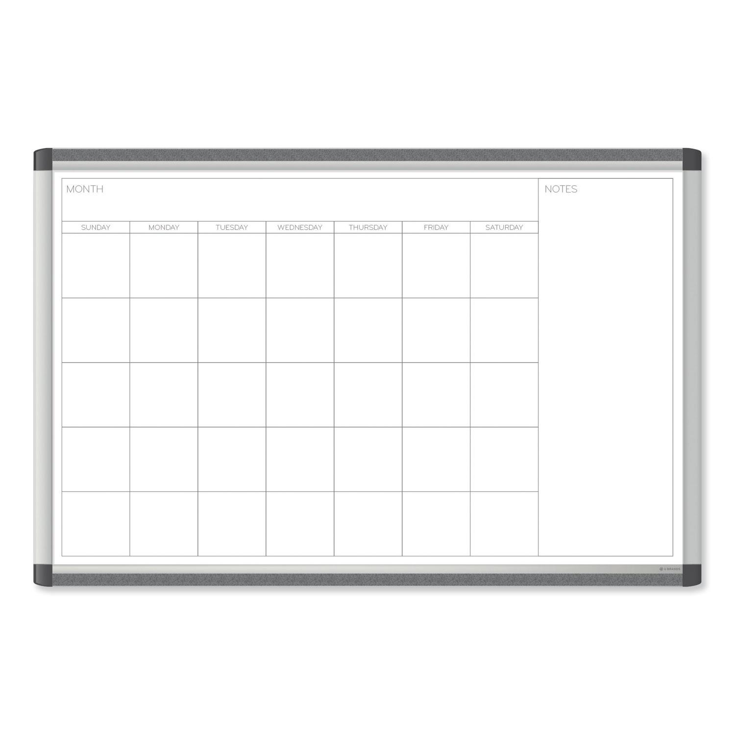Silver aluminum PINIT frame magnetic dry erase calendar board is a perfect and functional solution for the frequent usage areas of your office, school classroom, home or any commercial space. Although all dry erase markers work well with this board, the U Brands dry erase markers provide the ultimate writing and eras-ability experience. Magnetic painted steel writing surface will require minimal ongoing cleaning care to ensure the best performance and resist ink staining and ghosting. Monthly view enables you to keep track of your hectic schedule. Simply use any dry erase board spray or wet dry erase board wipes after continuous use to clean the writing surface. Magnetic writing surface functions as a bulletin board as well; simply use any board magnets to pin all of your notes, messages, pictures, memos, calendars, menus, reminders and more. You may also attach all U Brands magnetic board markers and accessories (sold separately) to the board surface without using the marker tray. Strong and thick insulation underneath the dry erase surface, combined with the aluminum frame provides a firm and rigid construction. Whiteboard has a universal mounting system, as it can be hung horizontally. Board Type: Magnetic Dry-Erase Calendar; Board Width: 36"; Board Height: 24"; Board Depth: 1".