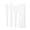 Go alternative with disposable PLA tableware -- it's made of a totally renewable plant-based bioplastic. Smarter and stronger, it also features a greater heat-tolerance rating than most petroleum-based plastics. Utensils completely degrade within six weeks of placement in commercial composting facilities. Cutlery KitKnife, fork, spoon and napkin. Utensils Type: Knife/Fork/Spoon/Napkin; Material(s): PLA; Color(s): Pearl White; Length: 6".