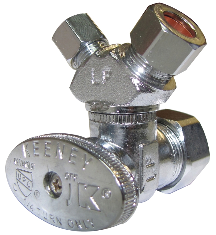 Plumb Pak Stop Valve, 5/8 x 3/8 x 1/4 in, Compression, 3 Ports/Ways, Chrome, Media: Water, 2-3/4 in W x 1 in D x 2-1/2 in H Dimensions