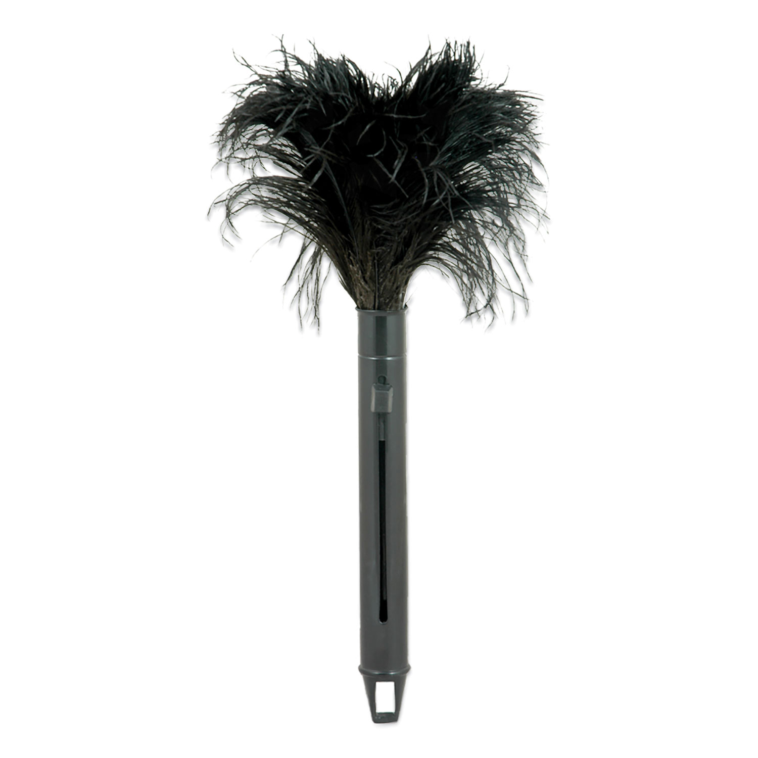 Flexible ostrich feathers get behind handles, inside slots and other tricky spaces. They hold dirt and dust until shaken for easy cleanup. Duster opens to 14 inches for greater reach. Bristle Material: Ostrich Feather; Bristle Color: Black; Handle Color: Black; Handle Length: 9".