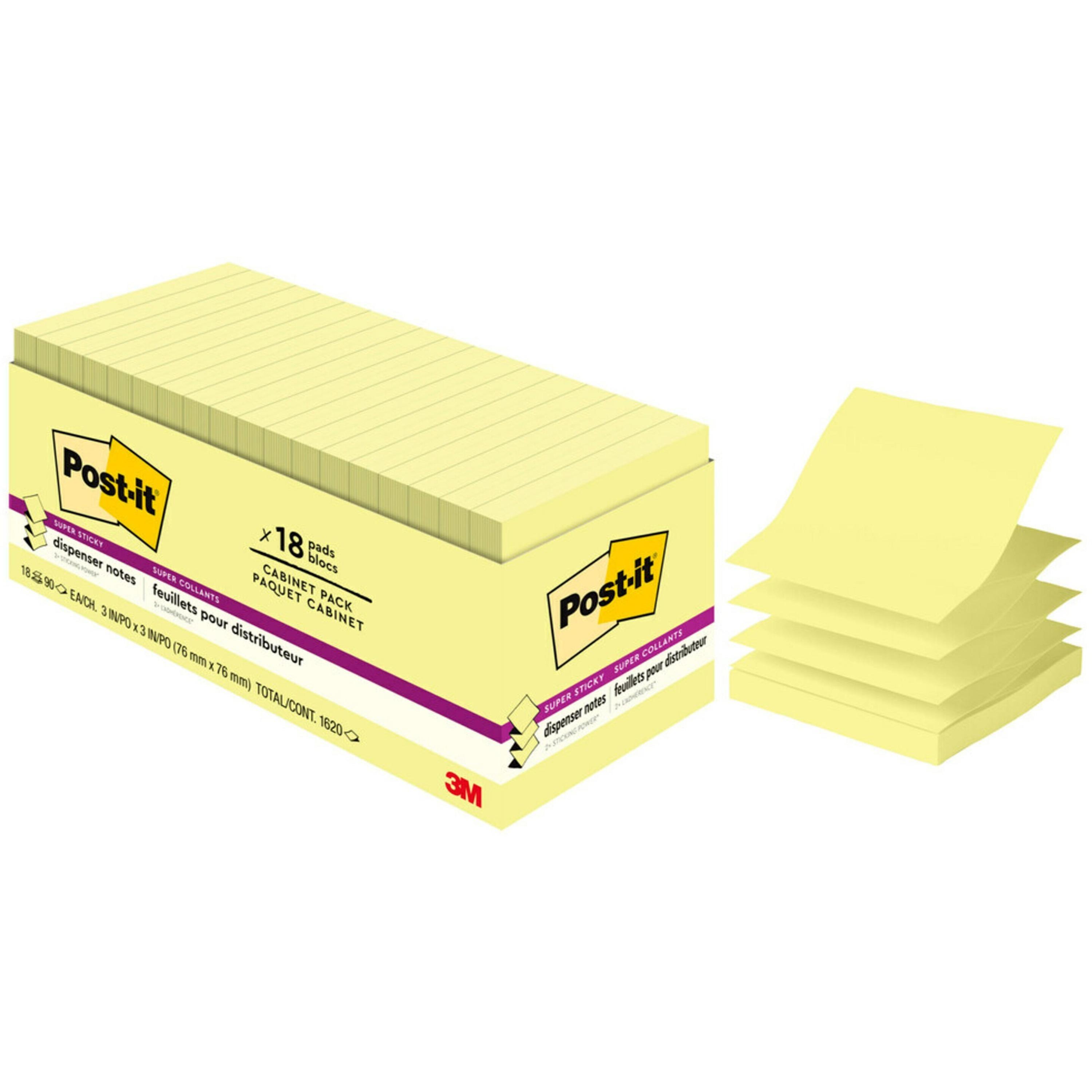 Post-it Super Sticky Dispenser Notes in 3 x 3 feature 2x the sticking power. These accordion-style notes are specially designed to work in Post-it Note Dispensers, and allow you to always have a note nearby to capture great ideas. Unique adhesive reliably sticks and re-sticks so your message can stay front and center. Move your notes with you throughout the day. Use for notes or reminders on doors, windows or walls. Colorful hues brighten your day. Post-it Super Sticky Dispenser Notes are recyclable. Cabinet PackIncludes 18 pads in a convenient tray to help you keep your supplies neat and organized. Pad Type: Super-Sticky; Shape: Square; Color(s): Canary Yellow; Color Family: Yellow.