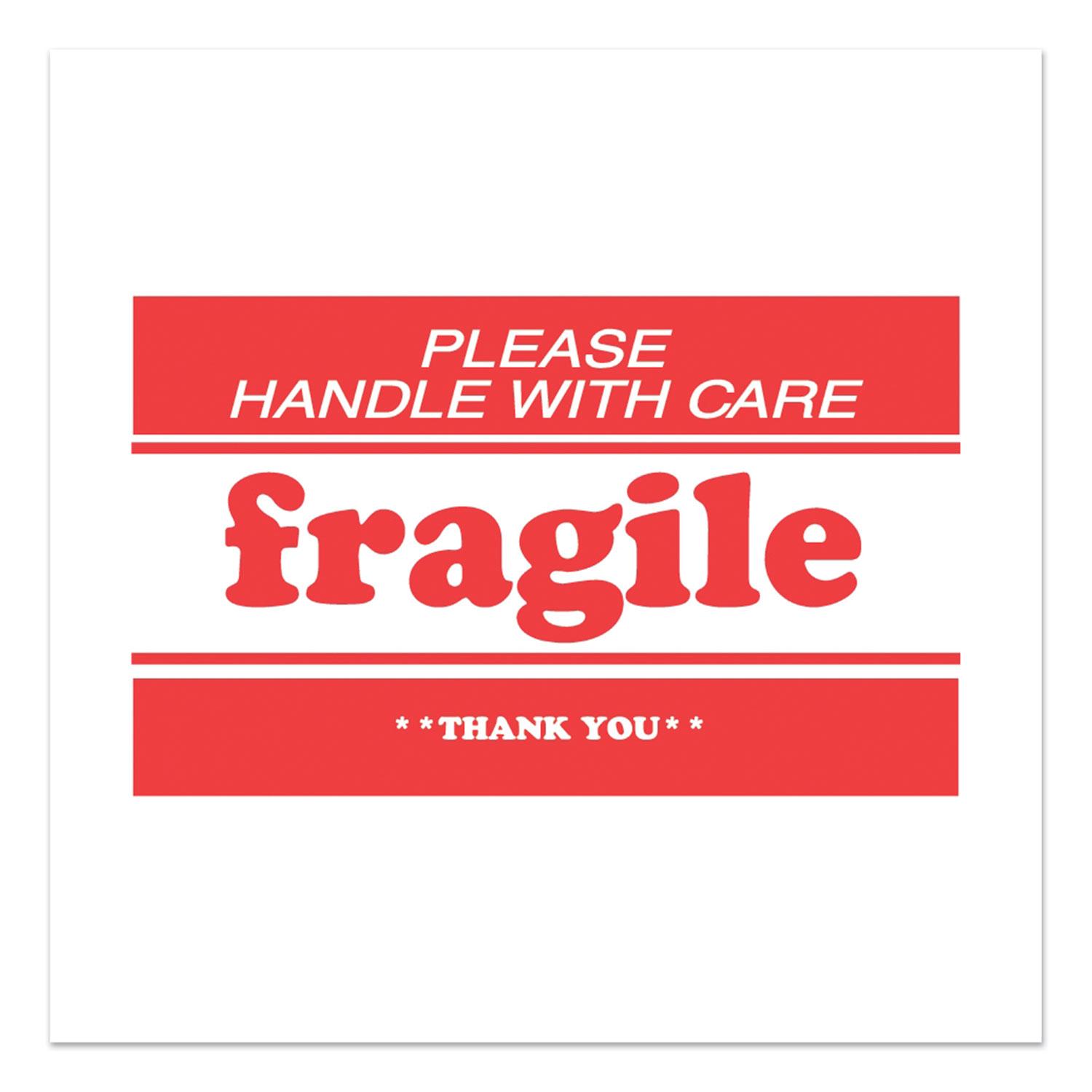 Draw attention to what matters. Pressure-sensitive permanent adhesive. Pre-Printed MessageFragile-Please Handle with Care-Thank You. Shape: Rectangular; Label Size - text: 2 x 3; Design: High-Contrast; Label Color(s): White/Red.