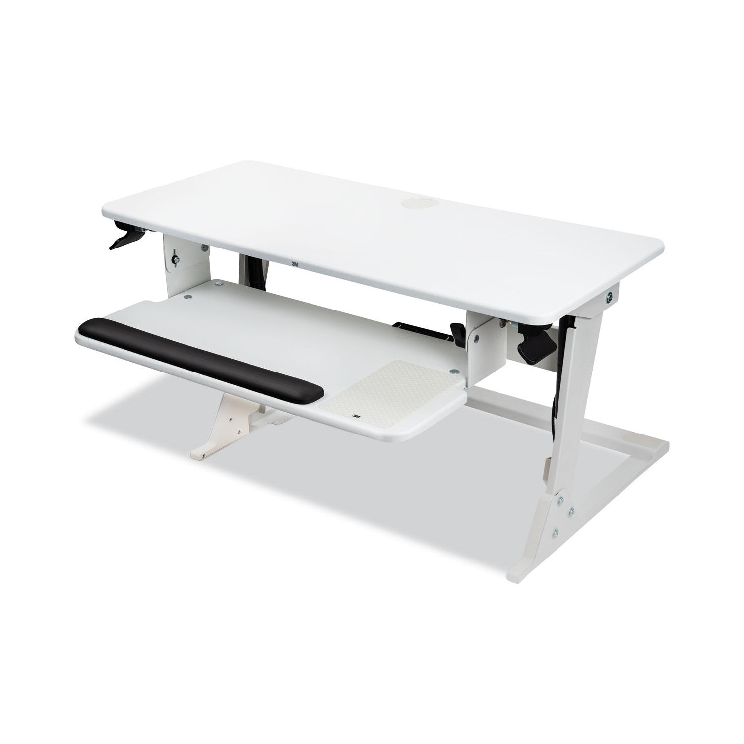Gas assisted continuous height adjustment allows you to move smoothly and quietly between sitting and standing positions in seconds. Height adjustment range from 6.2'' to 20'' above the desk accommodates a wide range of users. 10/-10 keyboard surface tilt to help achieve comfortable typing position. Primary work surface is large enough to fit two 24'' monitors and holds up to 35 lb. Includes 3M Gel Wrist Rest for your keyboard and 3M Precise Mouse Pad. Pre-assembled solution eliminates need for installers. Series Name: 3M Precision; Worksurface/Base Color: White; Color Family: White; Worksurface Shape: Rectangular.