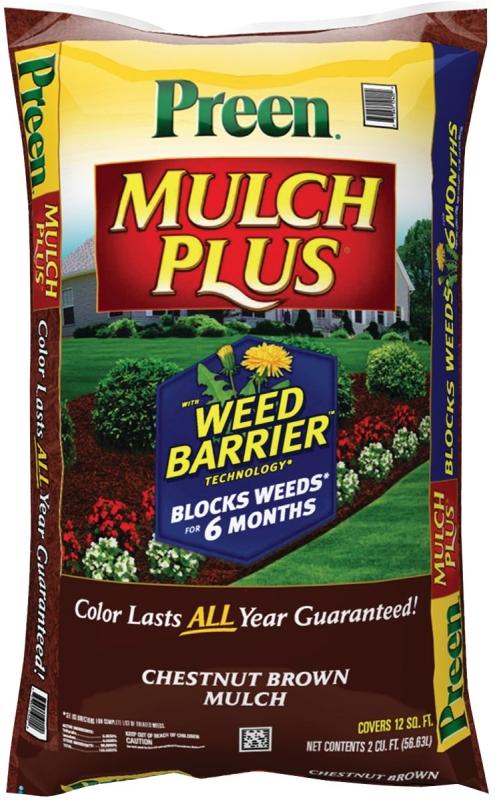 Blocks weeds for 6 months. Mulch color lasts all year. Covers 2 cu-ft.