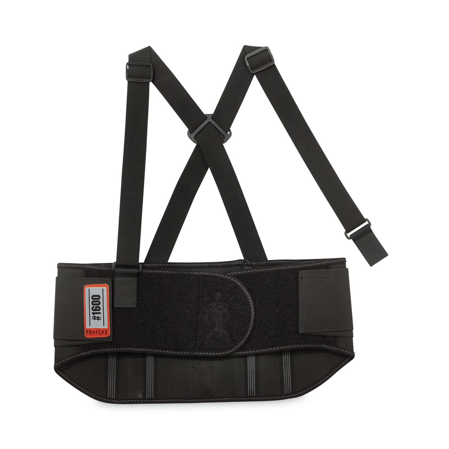 The ProFlex 1600 Standard Elastic Back Support Brace is designed to remind workers of proper lifting techniques while also enhancing the body's intra-abdominal pressure, moving the stress away from the spine for back-pain relief. Premium, all-elastic body with a 9" wide belt provides extra-firm support, and a contoured, high-cut front panel delivers a more comfortable fit. Before lifting heavy objects, simply tighten the support belt to enhance the bodys intra-abdominal pressure; and after lifting, just loosen the belt to achieve a wider range of motion. Secure-fit, interior rubber-track webbing prevents the belt from riding up when bending or lifting. Innovative Power Panel Positioners keep the tension bands close-to-hand, making it easy to get the desired level of tension. Non-conductive polypropylene stays help ensure long-lasting integrity. Adjustable, detachable suspenders allow the wearer to tailor the shoulder-fit to his or her unique needs. For best results, the support should fit snugly around the wearer's hips, with the front of the support two-fingers below the wearer's navel. When worn correctly, workers can easily maintain the proper posture for lifting, while achieving the extra support required to safely complete the task. Easy-to-use hook-and-loop closure keeps the belt securely fastened while in use. Brace can be worn over or underneath clothing. Machine washablemachine-wash cold and air dry. General Category: Work/Safety Gear; Sub-Category: Work Harness; Color(s): Black; Color Family: Black.