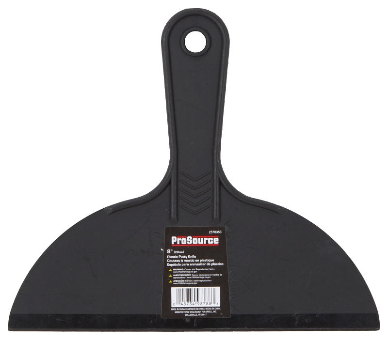 The ProSource Putty Knife has a plastic blade with a plastic handle. It has a hang hole to make stocking easier for retailers. This can be used for light-duty construction or home projects with easy spreading and easy cleanup.