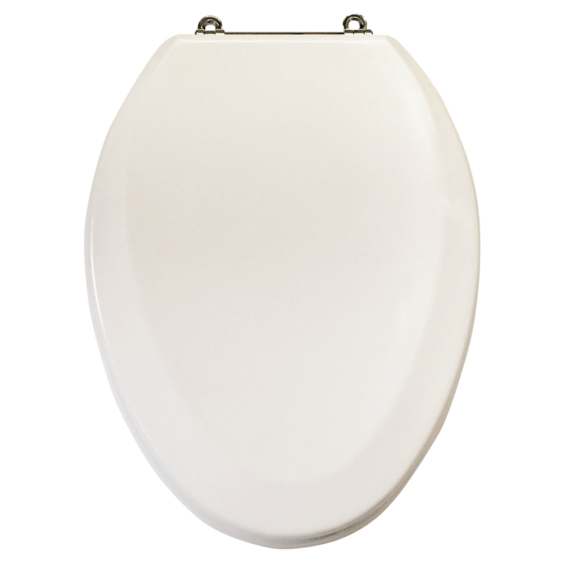 The ProSource toilet seat is made of MDF molded fiberboard wood composition with a high-gloss finish. Includes chrome hinges, bolts, and nuts.