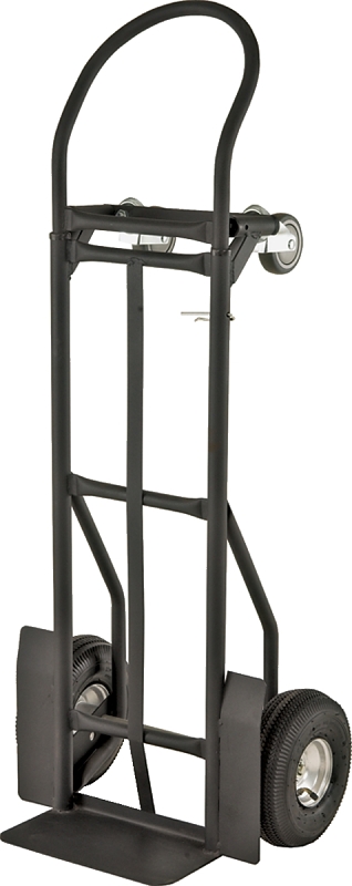 800 lb. horizontal position capacity. 400 lb. vertical position capacity. Heavy duty 1 in Dia steel frame. Full size wheel fenders. 4 in x 1-1/4 in TPR casters. 10 in x 3-1/2 in pneumatic tires. Heavy duty ball bearings. Steel rims. Toe plate: 14 in W x 7-3/4 in D. Adjustable height handle with 2 positions. Heavy-duty 5/8 in axle. Overall size vertical position: 54-1/4 in- 58-1/4 in H x 21-1/4 in W x 17-1/4 in D. Overall size horizontal position: 44-1/2 in H x 21-1/4 in W x 48-3/4 in D.