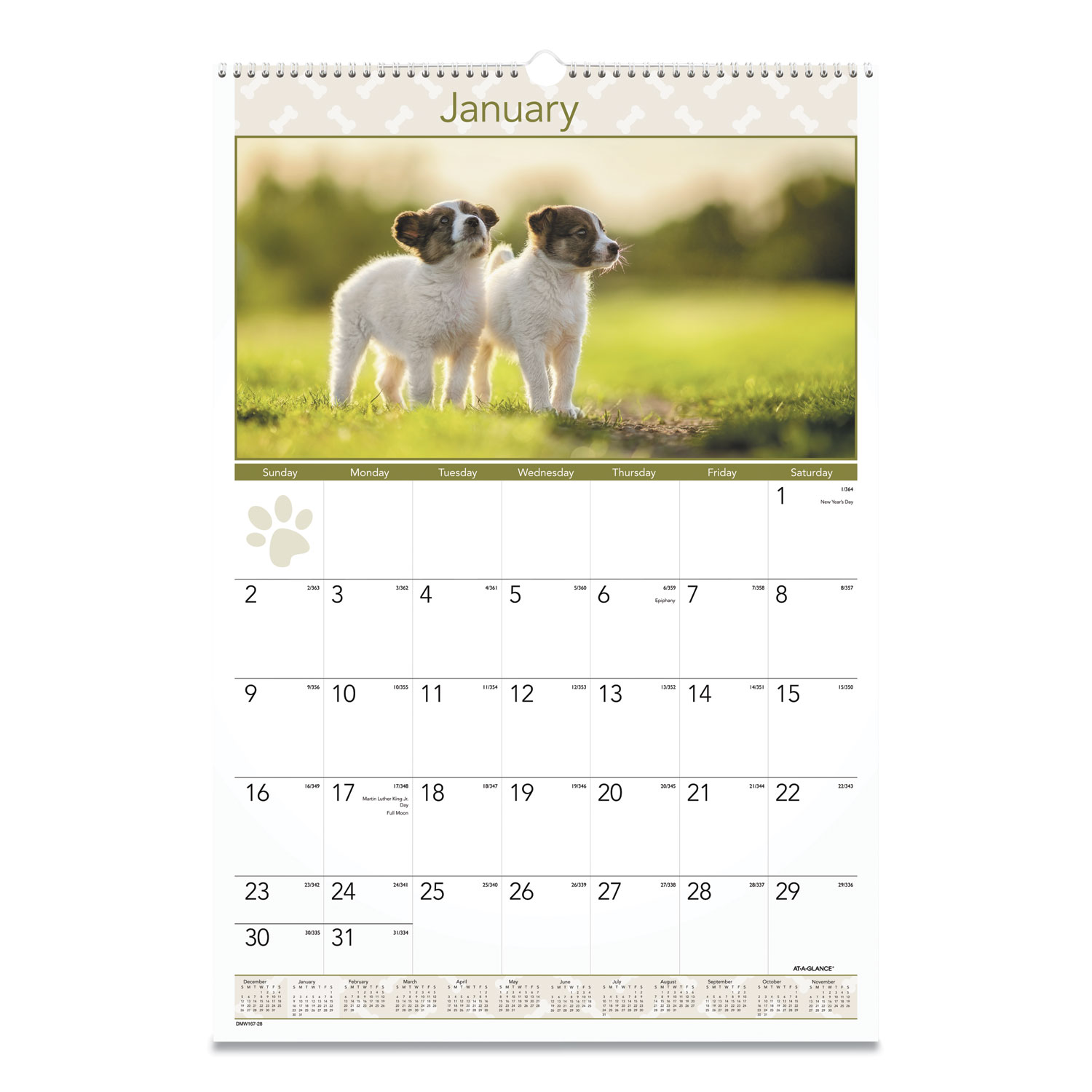 Smile with a different adorable puppy each month. Features full-color photos. One month per page. Full-year calendar reference; federal holidays highlighted. Bonus page: current year reference calendar; chipboard backing; wirebound with hanging loop. Printed on high-quality paper with superior ink bleed resistance. Size: 15.5 x 22.75; Page Color/Theme: Puppies; Edition Year: 2021; Calendar Term: 12-Month (Jan-Dec).