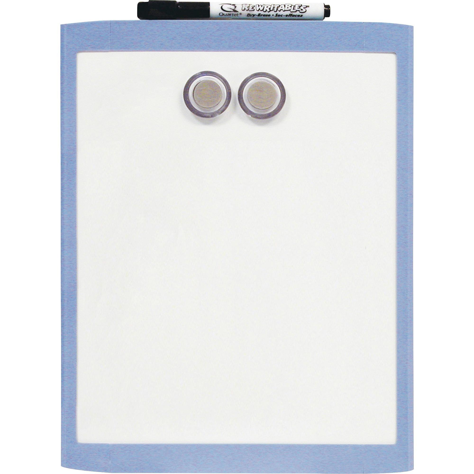 Stainless steel board, double as a magnetic bulletin board. Plastic frame in assorted colors. Includes board, marker with eraser cap, mounting hardware and two round magnets. Dimension of 11 in W x 8-1/2 in L.