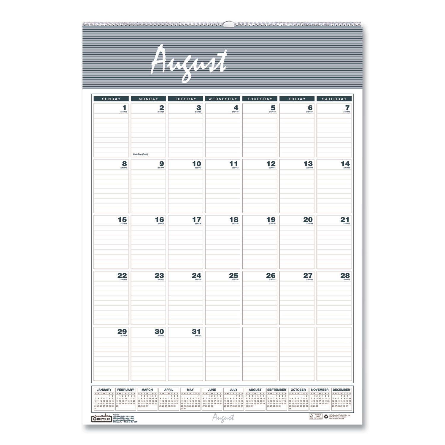 Ruled daily blocks keep notations neat. Full-year reference calendar aids in planning throughout the year. Neutral graphics match any dcor. Wirebound with a full chipboard backer and a sturdy wire hanger. Made entirely of recycled materials. Size: 12 x 17; Page Color/Theme: Blue/Gray; Edition Year: 2020-2021; Calendar Term: 12-Month (Aug-July).
