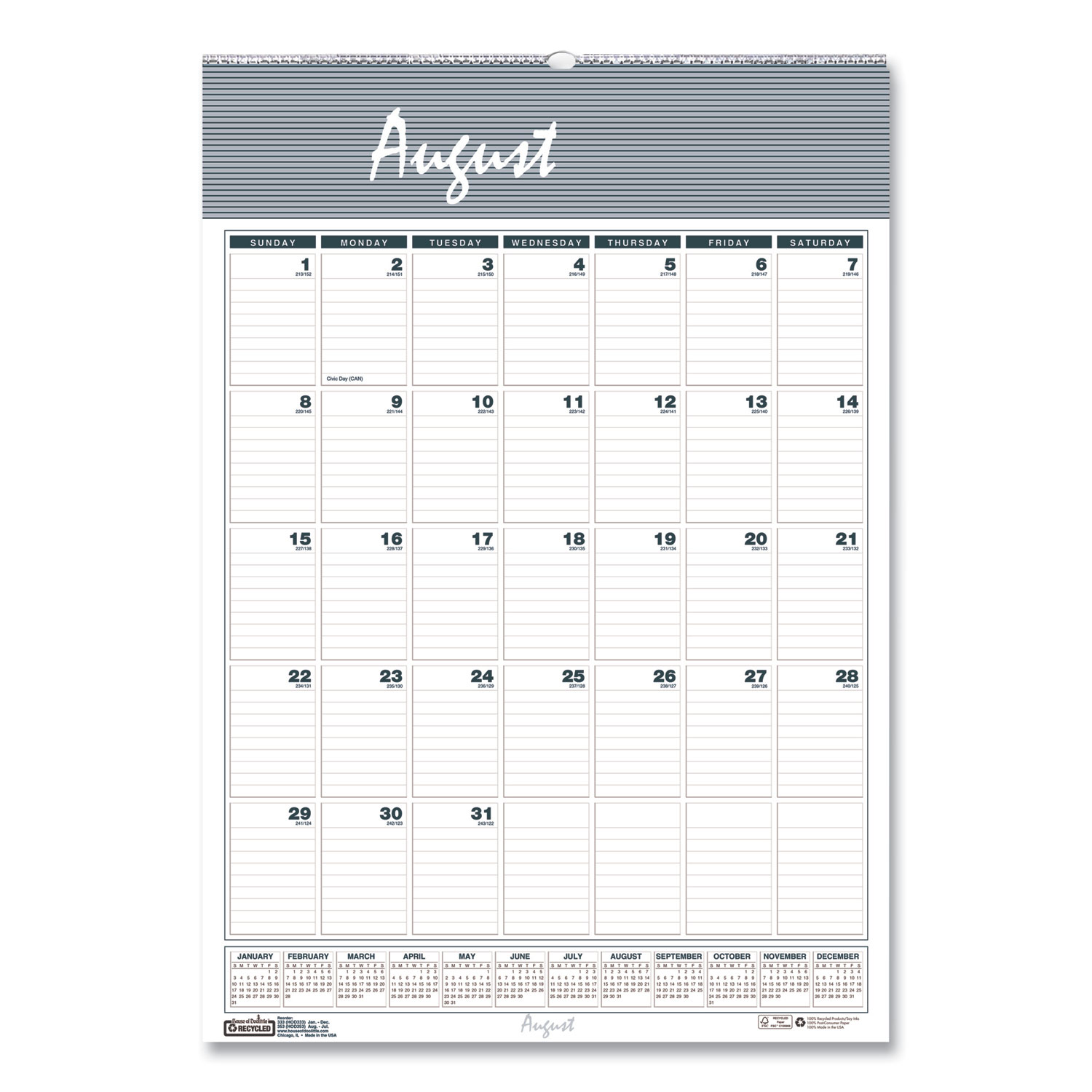 Ruled daily blocks keep notations neat. Full-year reference calendar aids in planning throughout the year. Neutral graphics match any dcor. Wirebound with a full chipboard backer and a sturdy wire hanger. Made entirely of recycled materials. Size: 15.5 x 22; Page Color/Theme: Blue/Gray; Edition Year: 2020-2021; Calendar Term: 12-Month (Aug-July).