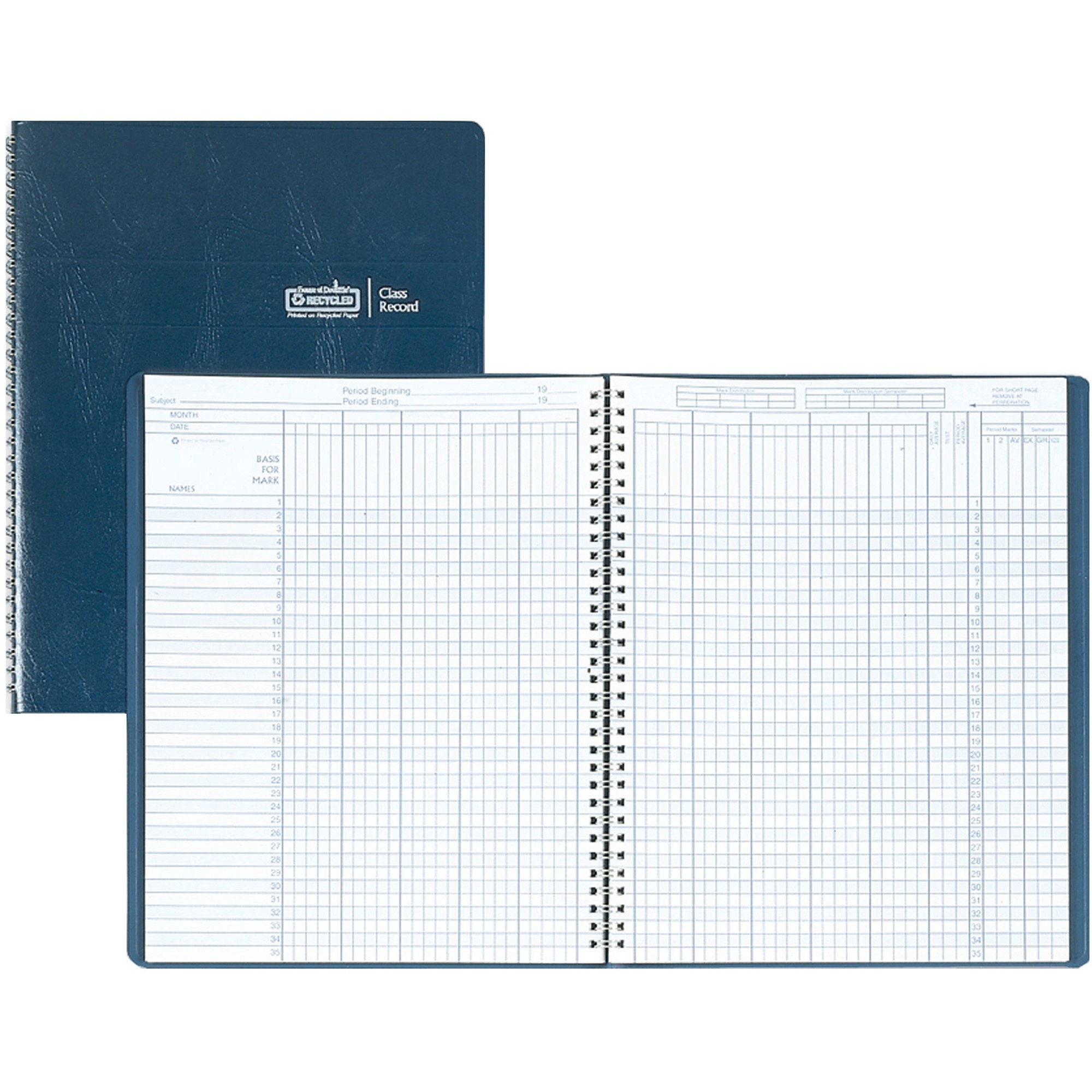 Designed for eight separate classes of 35 students, each, during a 40-week school year with nine-to-ten-week grading periods. Features perforated pages and large squares for recording notes as well as a parent-meeting log, student-information pages and seating charts for each class. Wirebound with a blue, embossed simulated-leather cover. Made entirely of recycled materials.