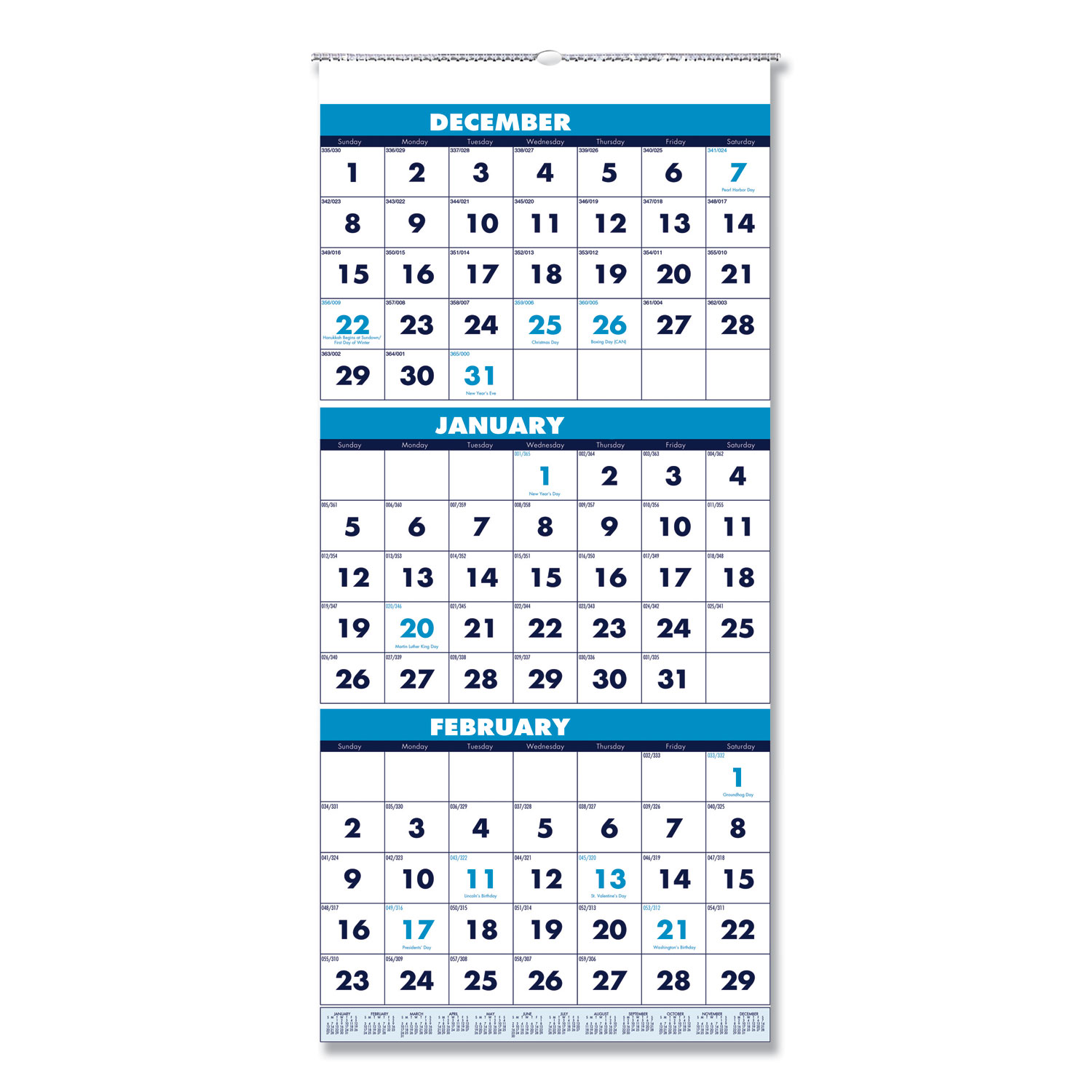 See three months at a time. Wall calendar details the prior, present and following month on each page. Large date numerals with holidays highlighted. Strong wire-binding firmly keeps the pages together and in place. Features a full, 12-month reference calendar for long-term planning. Sturdy wire hanger makes it easy to hang the calendar on the wall. Made entirely of recycled materials. Vertical Format. Size: 12.25 x 26; Page Color/Theme: White; Edition Year: 2020-2022; Calendar Term: 14-Month (Dec-Jan).