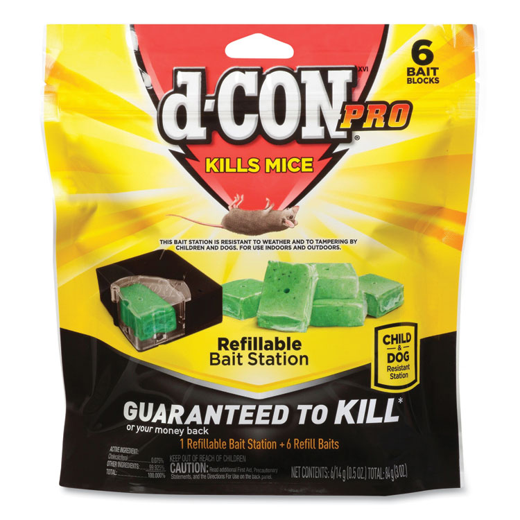 This refillable bait station is ready to gono work necessary on your part. Product is weather-, child- and dog-resistant, so it's safe to use around your home. Good for both indoor and outdoor use. Its low profile makes it an excellent choice for discreet usage and for use in high traffic areas. 6 Refills. Rodent Control Product Type: Poison; Application: Indoor/Outdoor; Target: Mice; Dimensions: 3" x 3" x 1 1/4".