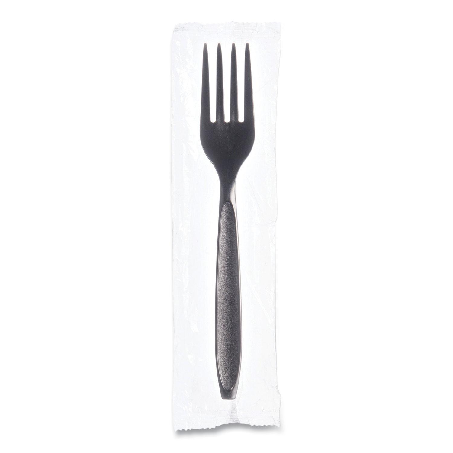 Elegant disposable cutlery may easily be used for special gatherings, casual dining or takeout/delivery. Optimized strength-to-weight ratio helps provide superior performance. Pieces feature an ergonomic grip. Utensils Type: Fork; Material(s): PS - Polystyrene; Color(s): Black; Grade: Mediumweight.