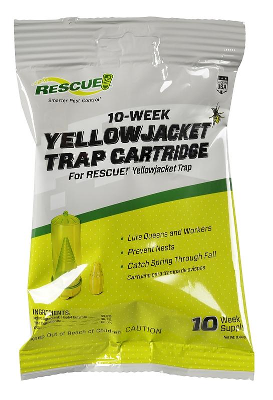The RESCUE! yellow jacket attractant cartridge works inside the RESCUE! Yellowjacket trap to lure all major species of yellow jackets. The cartridge lasts 10 weeks. Yellowjacket fly to the trap, enter through the bottom holes, fly or crawl up through the cone and get trapped inside the clear yellow chamber where they dehydrate.