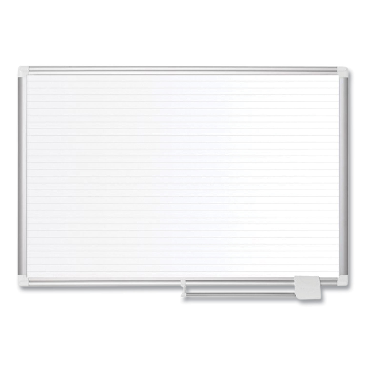 Pale gray rule lines simplify text and magnetic accessory alignment. Magnetic lacquered steel dry erase surface is recommended for frequent use. Sturdy aluminum frame features a sliding pen tray and an easy four-corner mounting system. Board Type: Magnetic Dry Erase Calendar; Board Width: 48"; Board Height: 36"; Surface Material: Gold Ultra Enameled Steel.