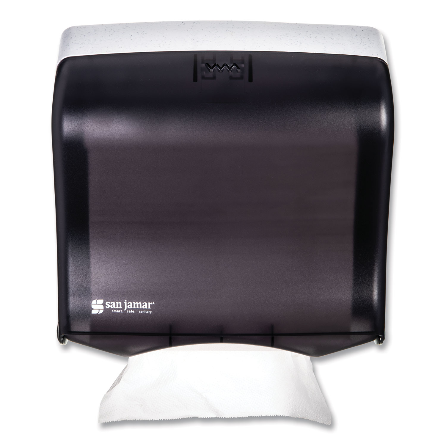 San Jamar C-fold/Multi-fold Towel Dispenser - C Fold, Multifold, Touchless Dispenser - 400 Multifold, 240 C Fold - 11.5" Height x 11.5" Width x 6" Depth - Plastic - Black Pearl - Compact, Durable, Impact Resistant| Towel dispenser features a clean, low-profile design for convenient use in small spaces. Simple six-piece assembly can be completed in only a few minutes for quick setup. Durable, impact-resistant construction ensures lasting use in nearly any environment. The Present System offers a smooth, one-at-a-time towel presentation to enhance efficiency and image. Towel dispenser holds 240 C-fold towels or 4000 multifold towels (each sold separately).Towel dispenser features a clean, low-profile design for convenient use in small spaces. Simple six-piece assembly can be completed in only a few minutes for quick setup. Durable, impact-resistant construction ensures lasting use in nearly any environment. The Present System offers a smooth, one-at-a-time towel presentation to enhance efficiency and image. Towel dispenser holds 240 C-fold towels or 4000 multifold towels (each sold separately).