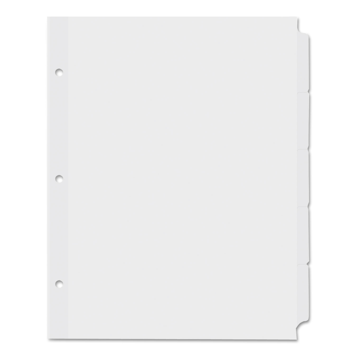Sort, collate, and index anything with these classic tab dividers. Crisp flat-white paper tabs accept any ink, pencil or printing. Index presentations in multiple binders easily and quickly. Three-hold punched for easy sorting. Clear plastic-strip binding edge, adds durability and prevents accidental tear-out. Index Divider Style: Customizable; Index Divider Size: 11 x 8.5; Punched/Unpunched: 3-Hole Punched; For Use With: Ring Binders.