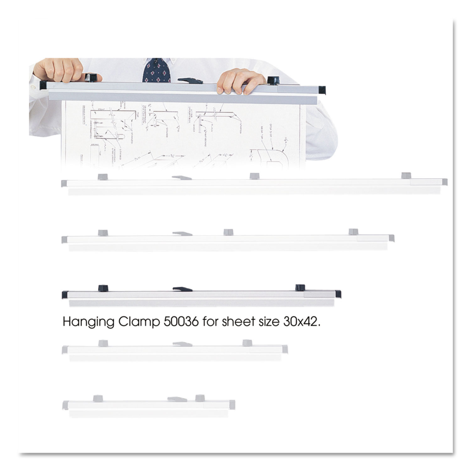 Presentation and filing is easy with the strength and clever design of these hanging clamps. Aluminum clamps with black nylon wing knobs provide balanced gripping tension. Each hanging clamp holds 100 sheets or 20 lbs. Includes clear plastic label holders. Six clamps per carton. Document Size Accommodation: 100 Sheets Per Clamp; Clamp Length: 30"; Overall Width: 31.25"; Material(s): Aluminum, Nylon.