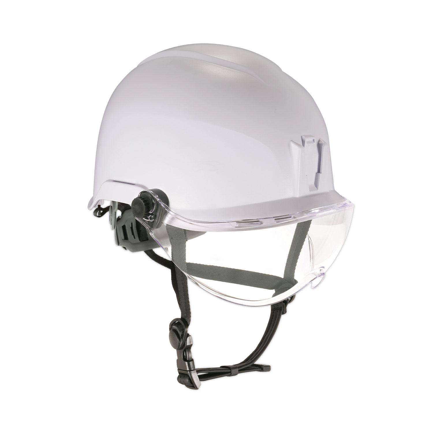 The Skullerz 8974V Class E (Electrical) Safety Helmet with 8991 Visor Kit features a dielectric shell and a six-point suspension system to provide heavy-duty, yet lightweight and comfortable, all-over-head protection from top, side, front and back impacts as well as high-voltage system contacts. For increased eye and face protection, 8974V helmets also include an easy-mount, removable visor that features a z87 UV-protective lens that's treated with Fog-Off and Tena-Coat technologies. Permanent Fog-Off, anti-fog technology ensures crystal-clear see-through, no matter the job, which is particularly useful for those working with face masks and respirators or those trekking though environments where extreme temperature changes are common. Reliable Tena-Coat technology provides durable scratch-resistance against kicked stones, windblown dust and a variety of other abrasive nuisances. The helmet's smaller, low-profile brim also helps improve the wearers field of vision, particularly when looking up, and its flexible, open-frame, multi-point adjustable-suspension design maximizes airflow for breathable, all-day wearing comfort. A one-size-fits-most format accommodates those who wear hat sizes 6.5 through 8, and a premium, easy-fit ratcheting system allows the wearer to tighten or loosen the internal suspension band without having to take the helmet off. Its one-handed fit-adjustment knob also pivots to improve overall ergonomics while providing extra clearance for bandana or ponytail knots. A padded, moisture-wicking, odor-resistant sweatband and top pad line the sides, forehead and top of the interior, and both the headband and top pad are removable for machine-washing and/or easy replacement. An integrated chin strap allows the wearer to secure the helmet in place to ensure protection during sudden movements, falls and impacts. Built with even weight-distribution and comfort in mind, all Skullerz 8974 helmets should deliver a snug, balanced fit to please nearly anyone. Patent-pending headlamp slots on the front and rear accommodate Skullerz Hard Hat Headlamps (lamps sold separately). From mountain-climbers to miners, from communication-tower technicians to pipefitters... whether you're on top of the world or deep within it, 8974 series safety helmets are designed to help you keep your head. Clear Visor Lens. Style: Front-Bill Cap; Material(s): PC ABS; Adjusting Method: Ratchet; Thickness: 5 mm.